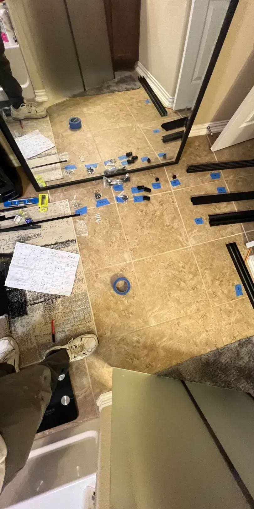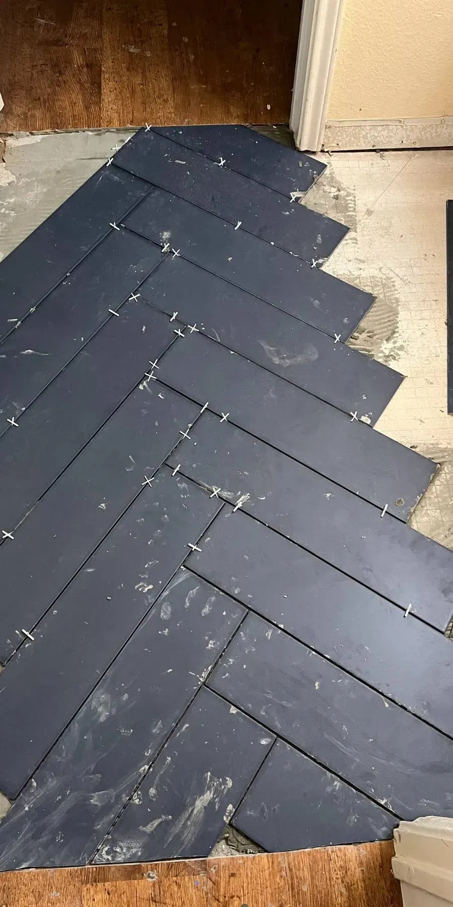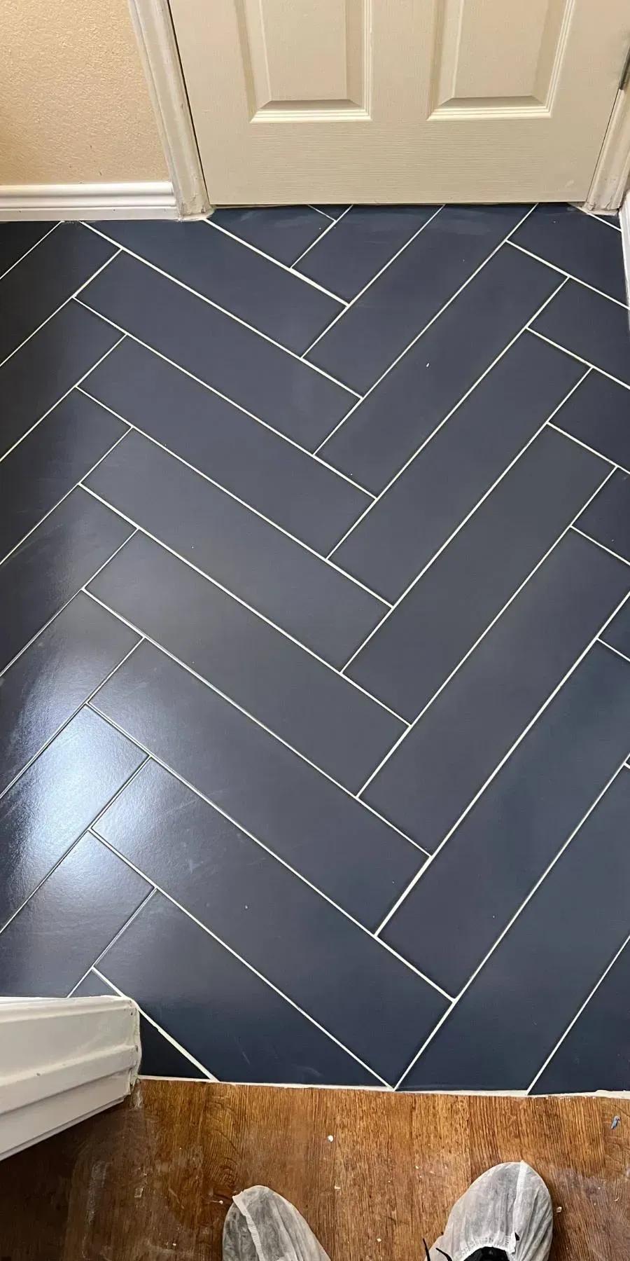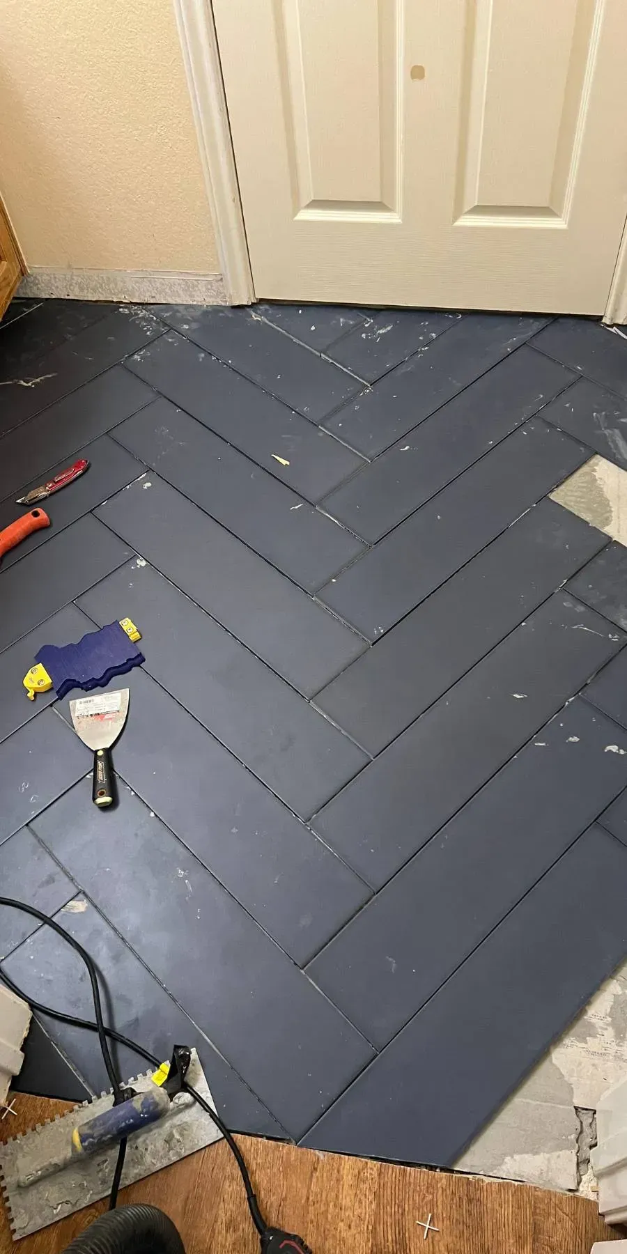 This floor was in rough shape and ready for a major upgrade. We removed the old flooring, leveled and prepped the surface, and installed sleek new tile in a bold herringbone pattern. The precision layout gave the space a modern, high-end look while also adding durability for everyday use. The finished floor completely transformed the room, making it both stylish and functional.