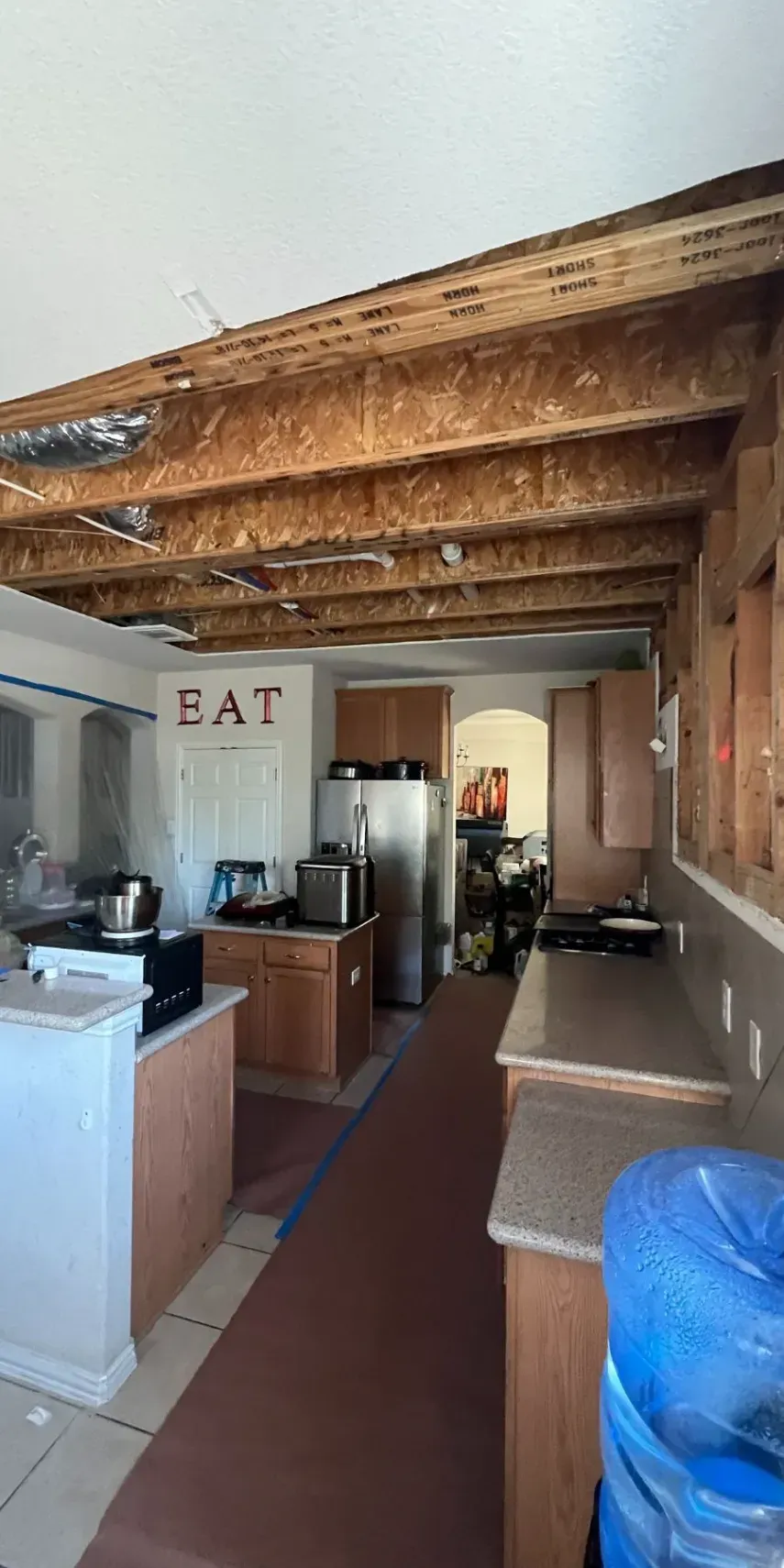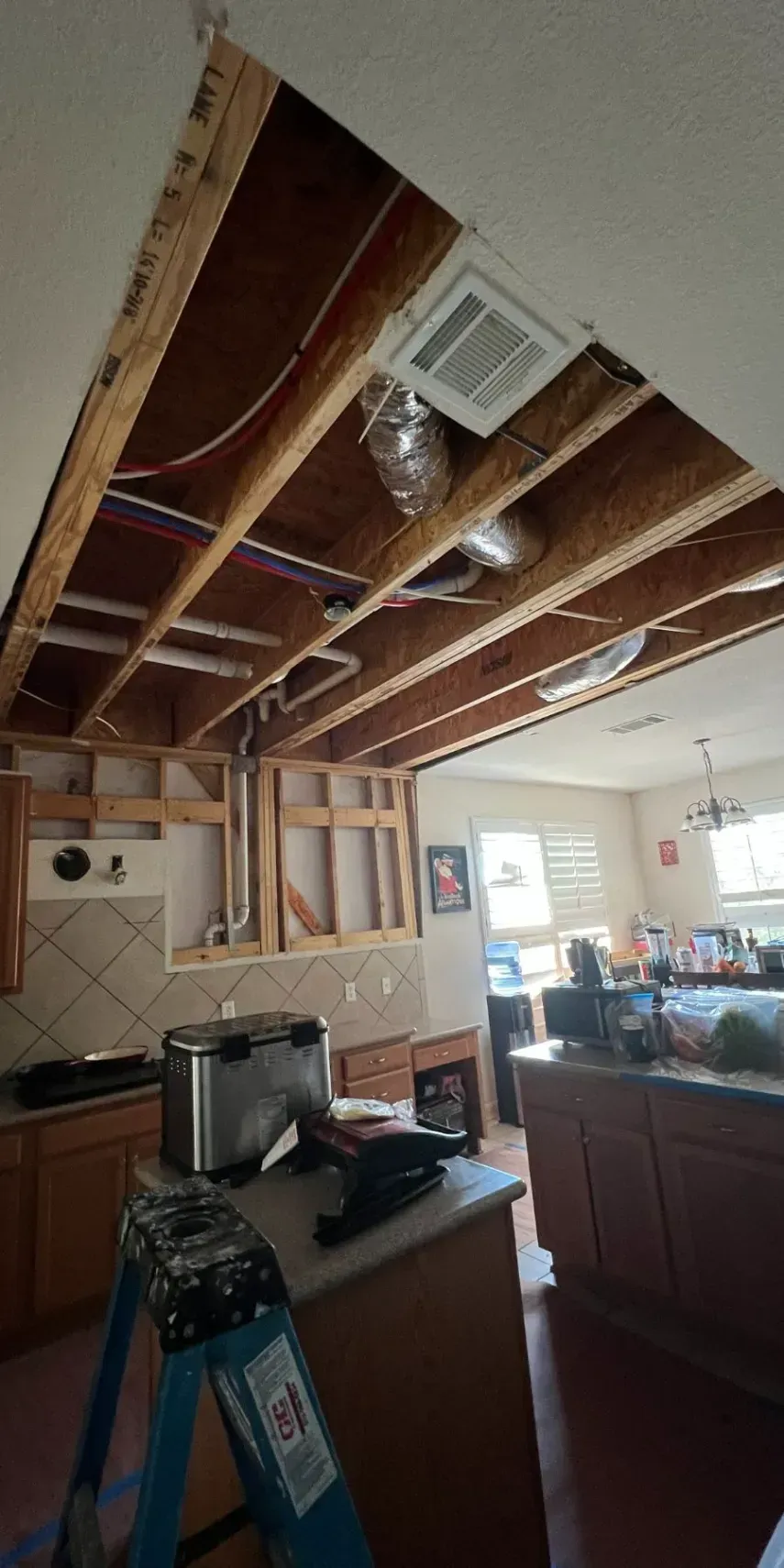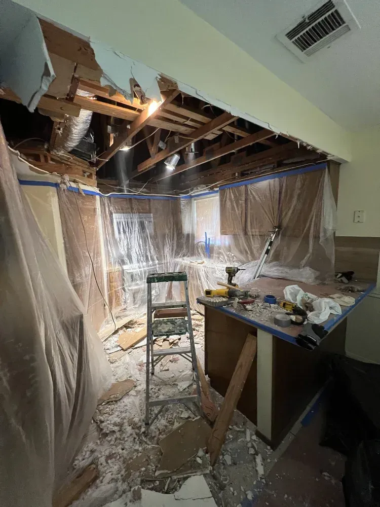 This ceiling had been damaged due to water intrusion, leaving exposed framing and compromised drywall. We began by removing the damaged material and prepping the kitchen to keep the rest of the home protected during the repair. Once the structure was ready, we installed new drywall, taped, and mudded the seams for a seamless finish. After sanding and painting, the ceiling looked brand new again—restoring both safety and a clean, polished look to the heart of the home.