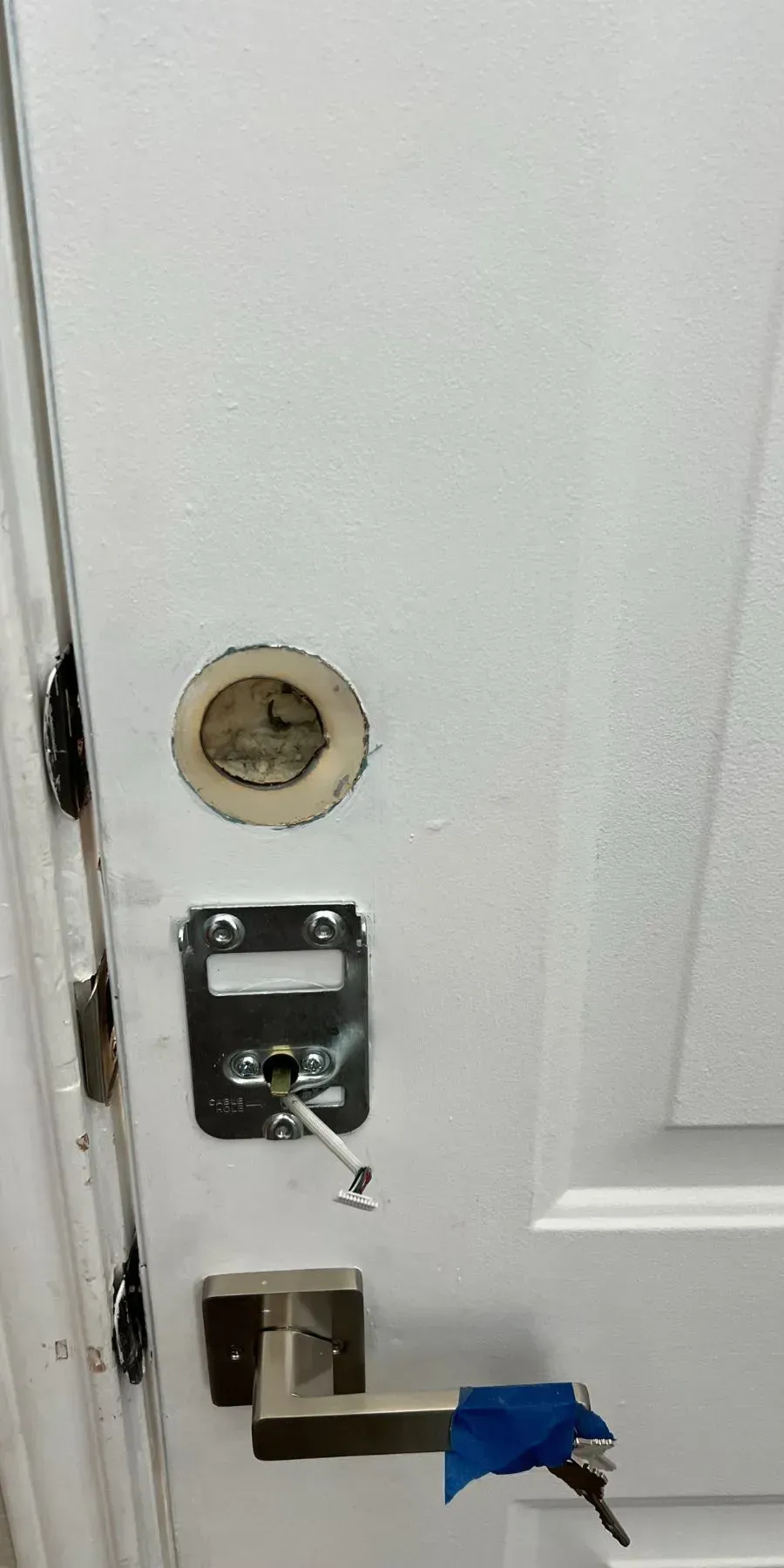 This front door needed an upgrade after the old deadbolt was removed. We installed a new smart deadbolt system, ensuring a secure fit and smooth operation. The replacement not only restored security but also added modern convenience, giving the homeowner peace of mind with a reliable lock they can trust.