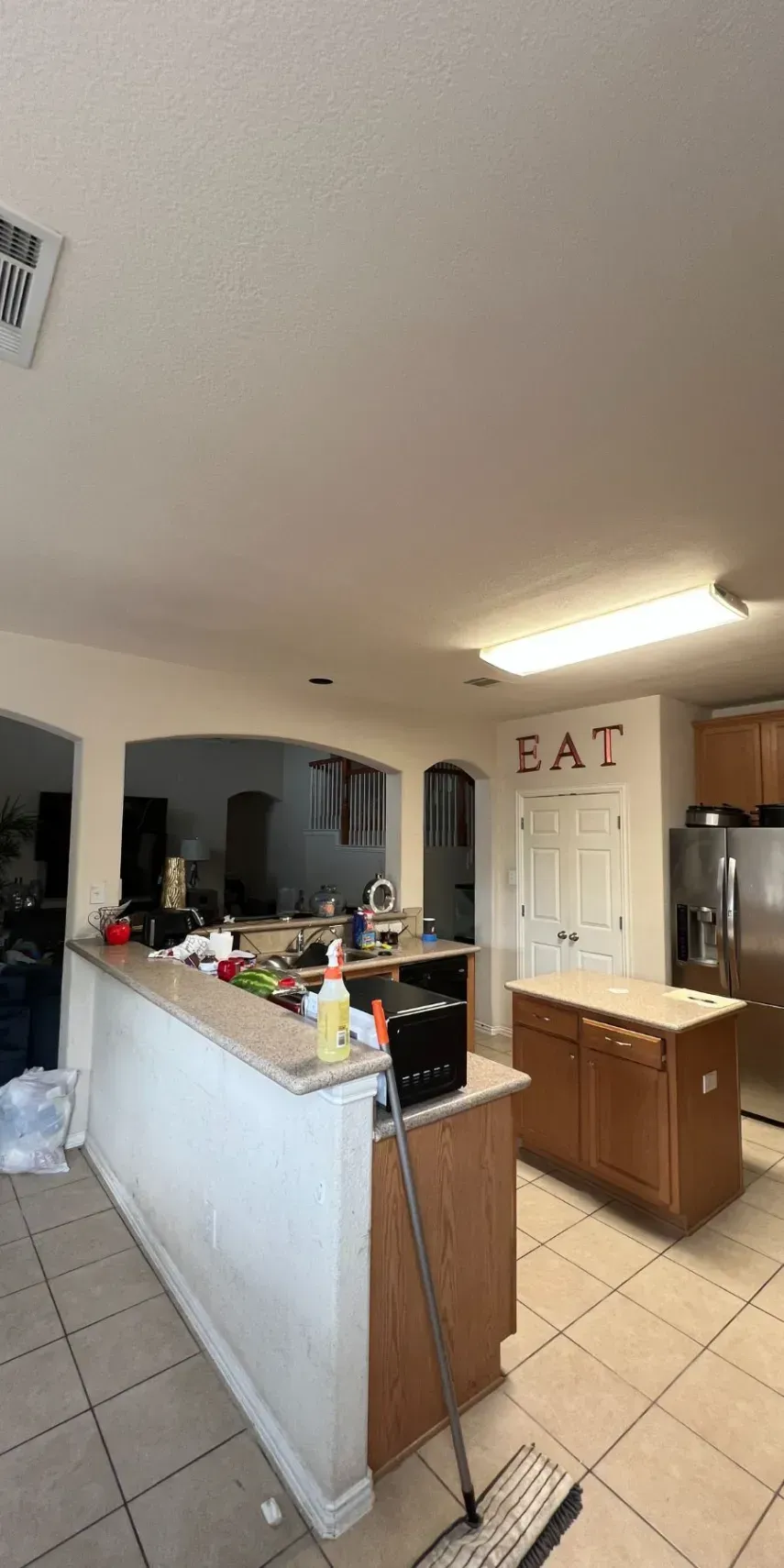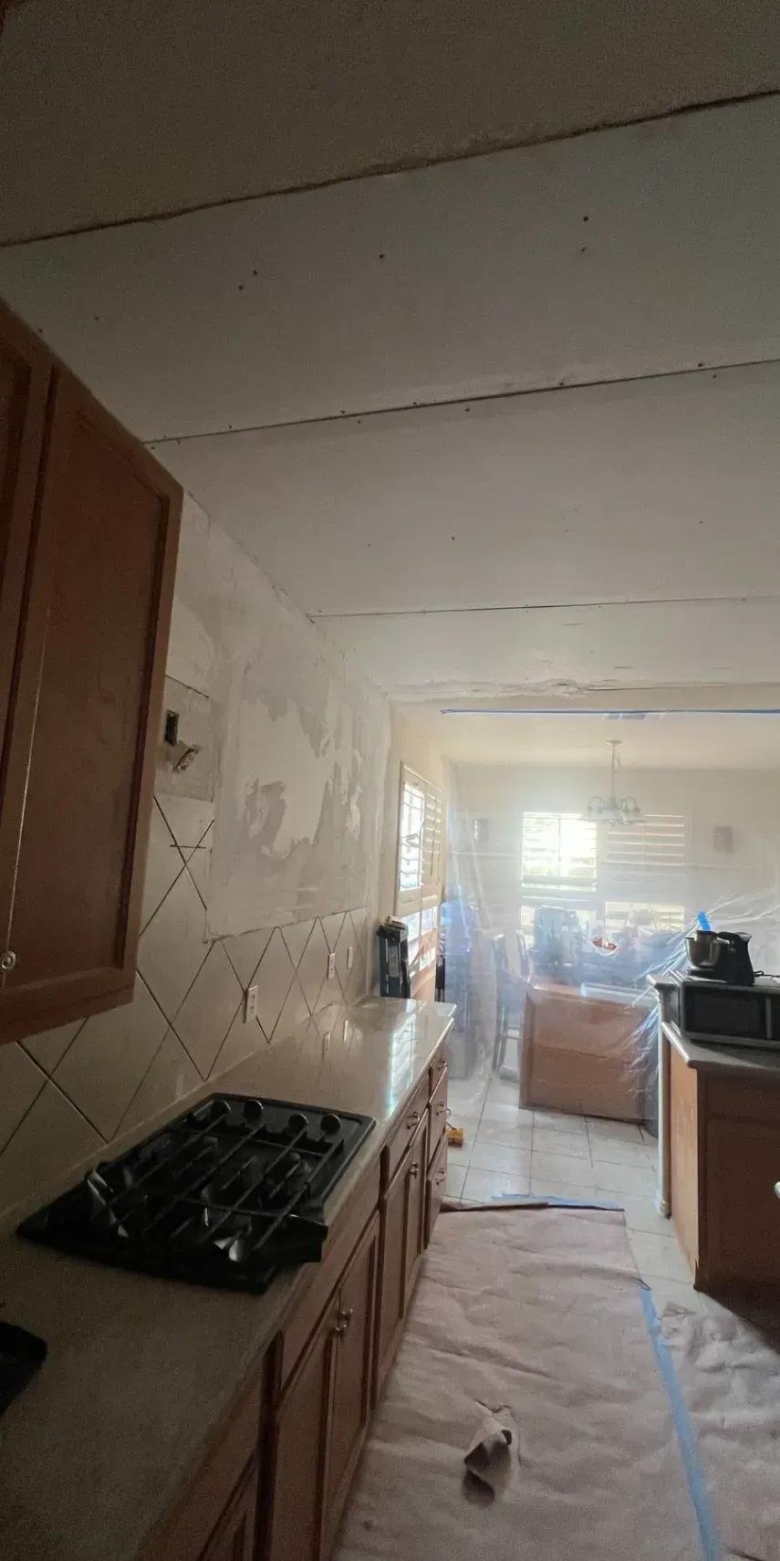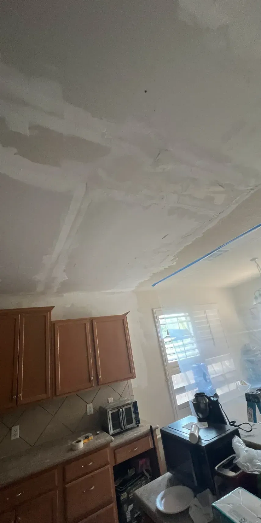 For this project, the homeowner’s kitchen ceiling had sustained water damage, leaving parts of the drywall soft, stained, and unsafe. Our team carefully prepped the space with protective coverings to keep the home clean, then removed the damaged sections of ceiling. We rebuilt the framework, installed new drywall, and finished with a smooth, seamless texture that blended perfectly with the existing space. After fresh paint and cleanup, the kitchen was fully restored — safe, polished, and ready to enjoy again.